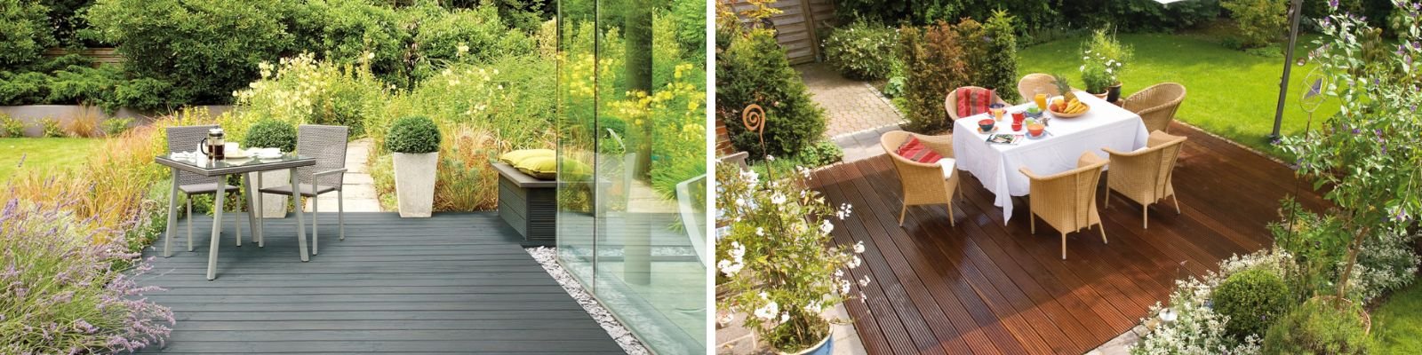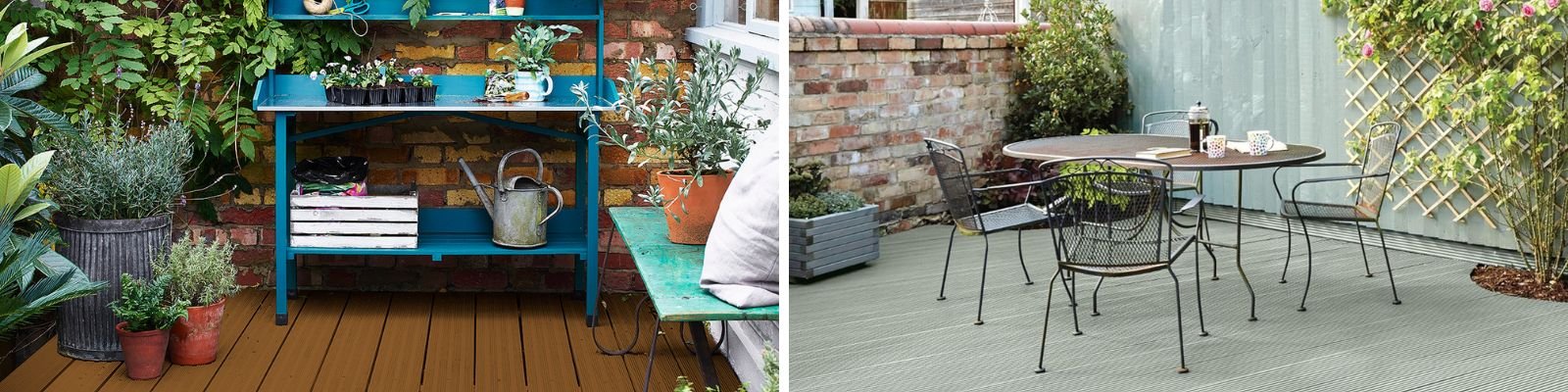 Deck on the left finished in Cuprinol Anti-Slip Decking Stain in Golden Maple. Deck on the right finished with Ronseal Ultimate Protection Decking Paint in Sage.