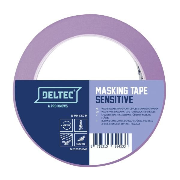 Deltec Purple Masking Tape is perfect When you need a straight line on vulnerable surfaces like newly dried paint or fresh wallpaper. Inside only, no paint bleed, no surface pull, very sharp lines. It’s even temperature-resistant to 60 degrees. No glue residue for 4 months!
